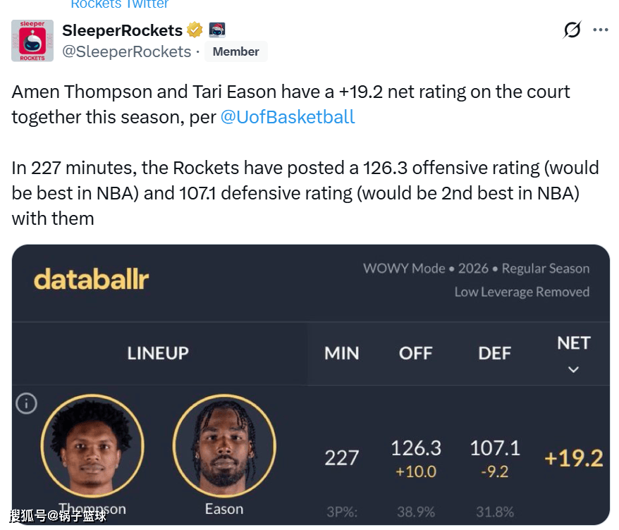 开赛至今,当伊森首发出战时,火箭队5战全胜,伊森与阿门同时在场时,进攻效率126.3联盟第一,107.1的防守效率联盟第二,净效率高达+19.2。