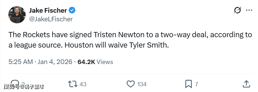 根据记者Jake Fischer报道,火箭队完成一签一裁,与后卫特里斯滕-牛顿签下双向合同,并为其裁掉前锋泰勒-史密斯腾出位置。