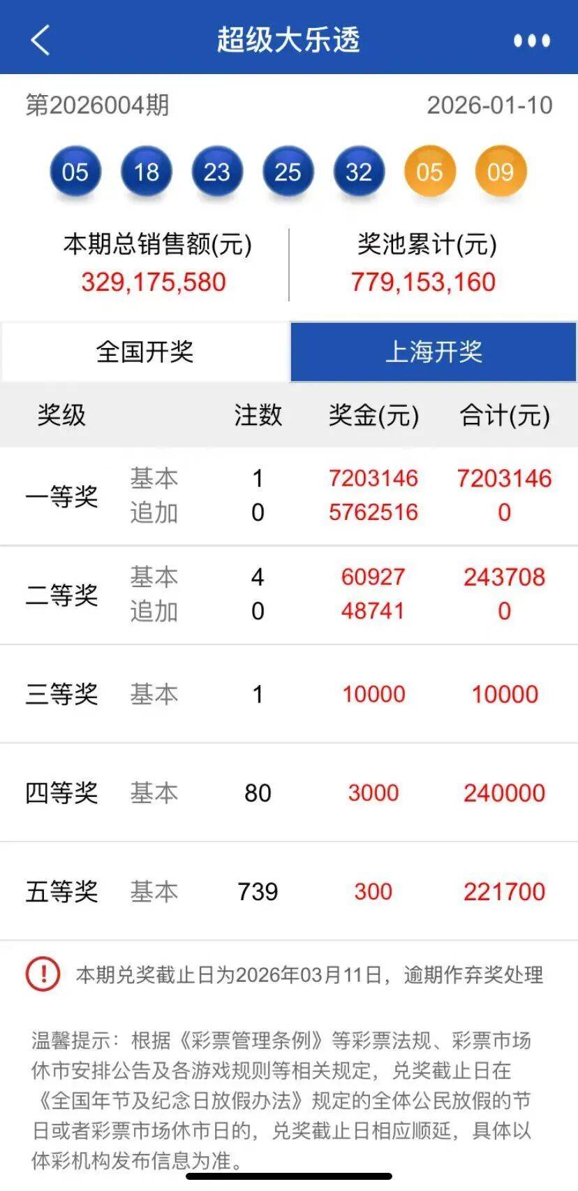 本期本市开出1注基础一等奖,出自一张票面金额为10元的5注直选单式票,单票奖金720万余元。该张大乐透彩票出自位于普陀区石泉路464号东南间的08033网点,这也是上海2026年诞生的首个大乐透一等奖。
