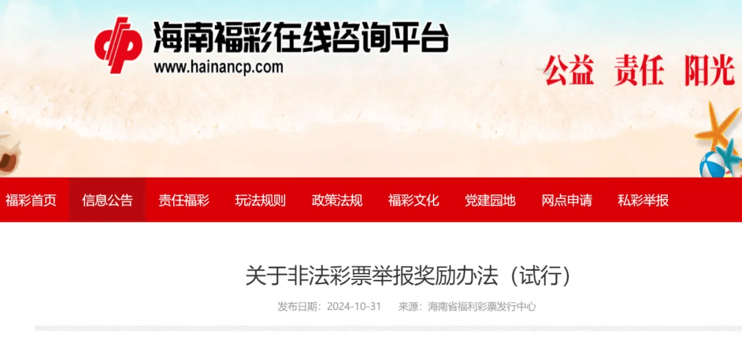 【快3彩票官方合作平台】实时同步开奖数据+投注技巧解析,精选高返奖率正规渠道。新用户注册(访问:363050.com 领取888U),支持网银/支付宝/微信支付,资金安全保障!海南省福利彩票发行中心也在官方网站上发布了《关于非法彩票举报奖励办法(试行)》