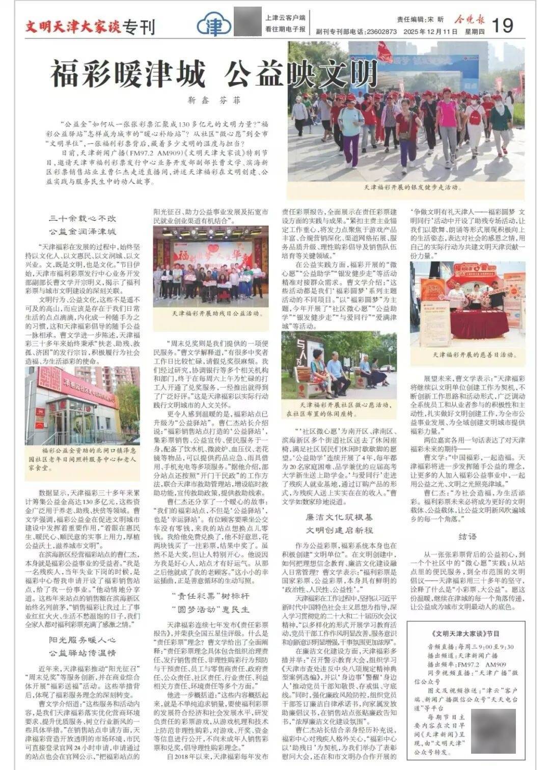 11月26日上午9:00—9:30,天津新闻广播(FM97.2 AM909)《文明天津大家谈》特别节目,邀请天津市福利彩票发行中心业务开发部副部长曹文学、滨海新区彩票销售站业主曹仁杰走进直播间,讲述天津福彩在文明创建、公益实践与服务民生中的动人故事。