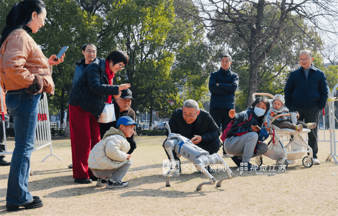 2月18日,常熟市虞山公园,一只机器狗吸引了不同年龄的围观者。白发长者与稚龄孩童一同俯身,专注地观察着这个科技“新伙伴”,好奇的目光跨越代际,暖意融融。朱燕 摄