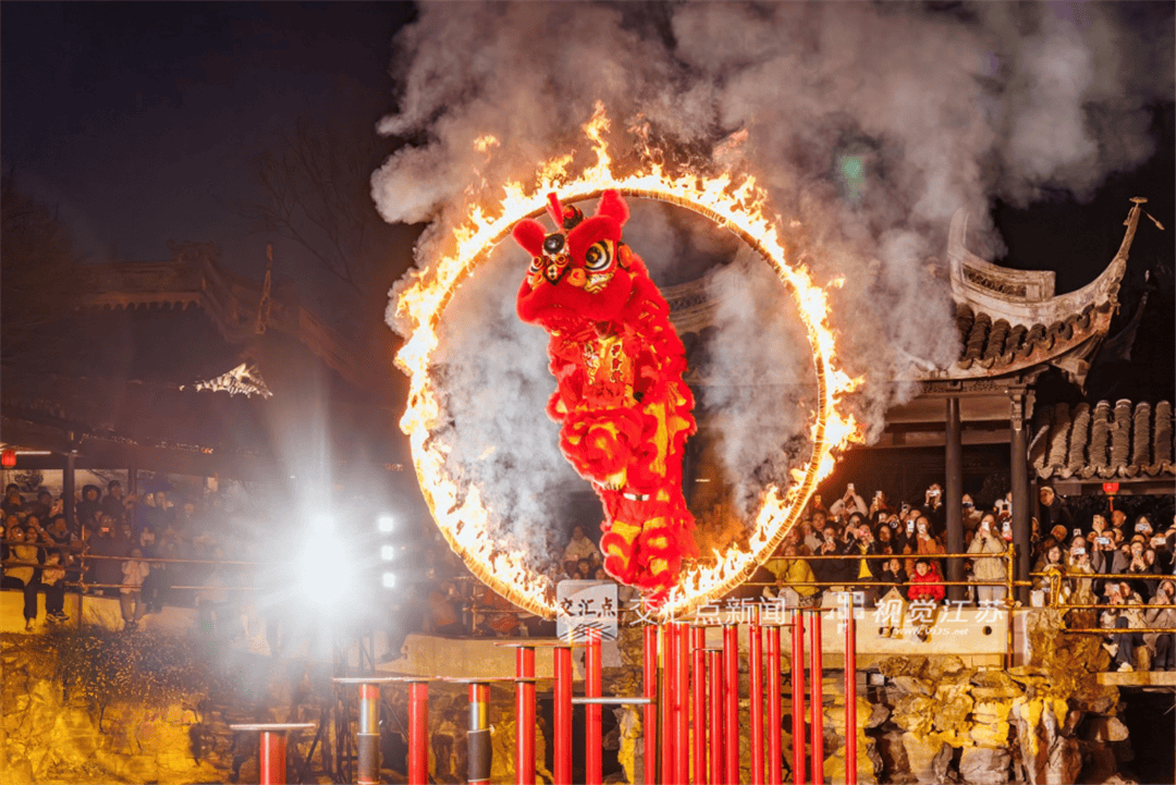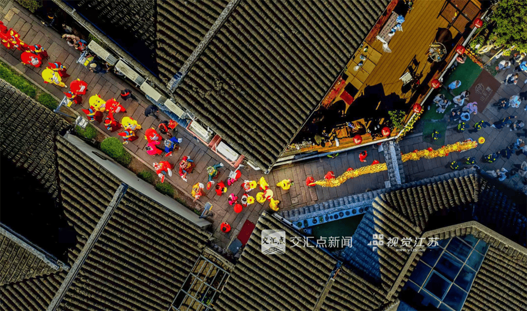 2月21日,盐城市珠溪古镇,市民们观赏景区安排的舞狮表演,欢度新春佳节。顾枫 摄