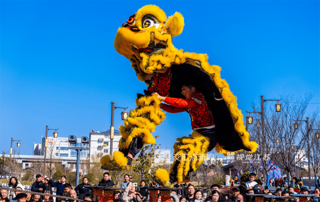 2月19日,宜兴市溪山雅达小镇,民俗表演者表演的舞狮梅花桩,引得游客阵阵叫好。朱智辉 摄
