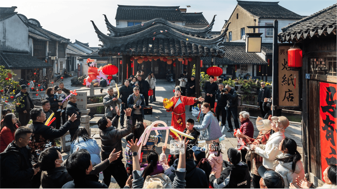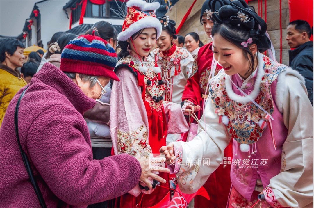 2月19日,苏州震泽宝塔街,国潮女孩和老奶奶玩起石头剪刀布,欢声笑语里赢礼物,热闹又暖心。潘娅婕 摄