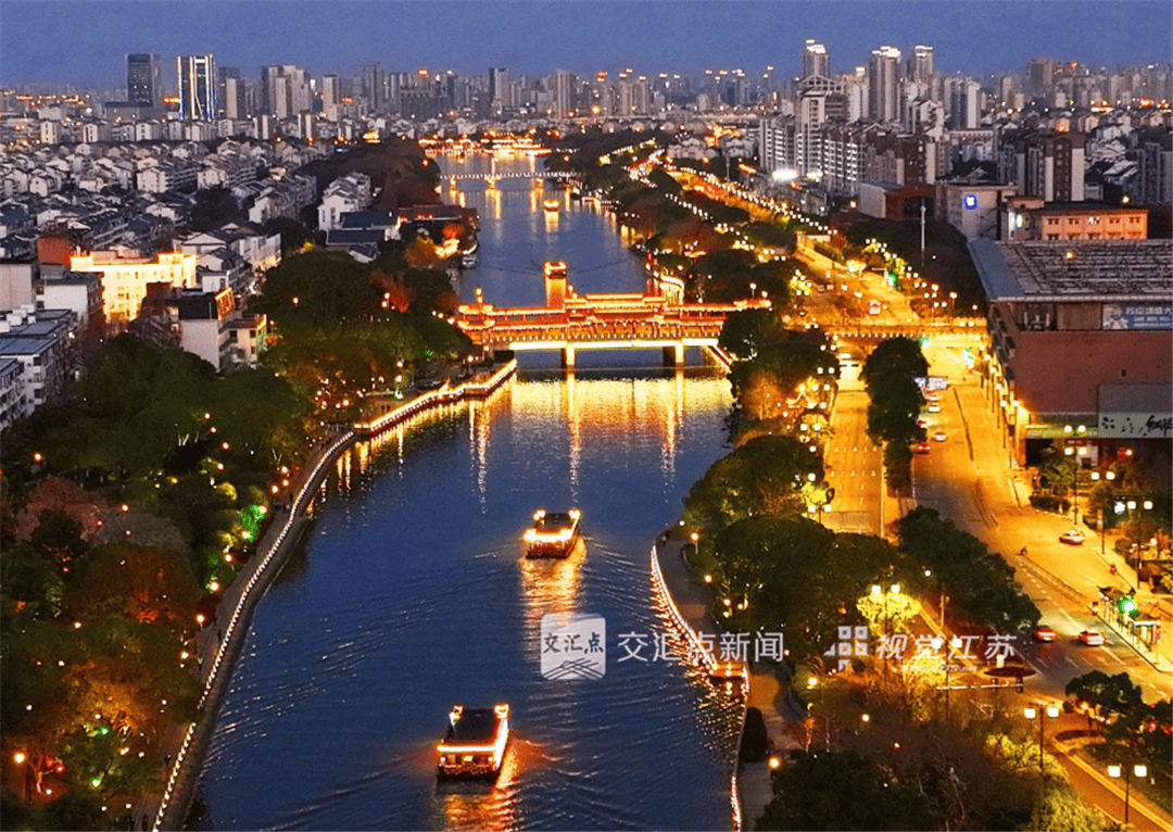 2月20日,苏州古运河畔,市民及游客或乘船夜游观光赏璀璨,或驻足古桥、岸边休闲游玩看夕阳,感受姑苏水城美轮美奂的迷人夜景。王建中 摄