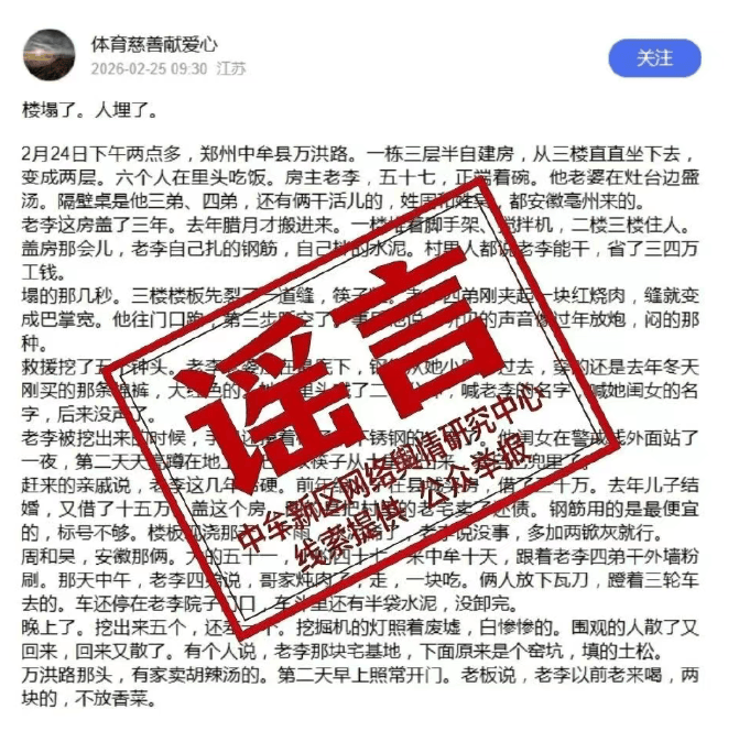 中牟发布通报,2月25日9时30分,网络账号“体育慈善献爱心”发布图文信息称“2月24日下午两点多,郑州中牟县万洪路一栋三层半自建房倒塌,多人被埋”等内容。经核查,该信息为网络谣言,相关内容纯属虚构。