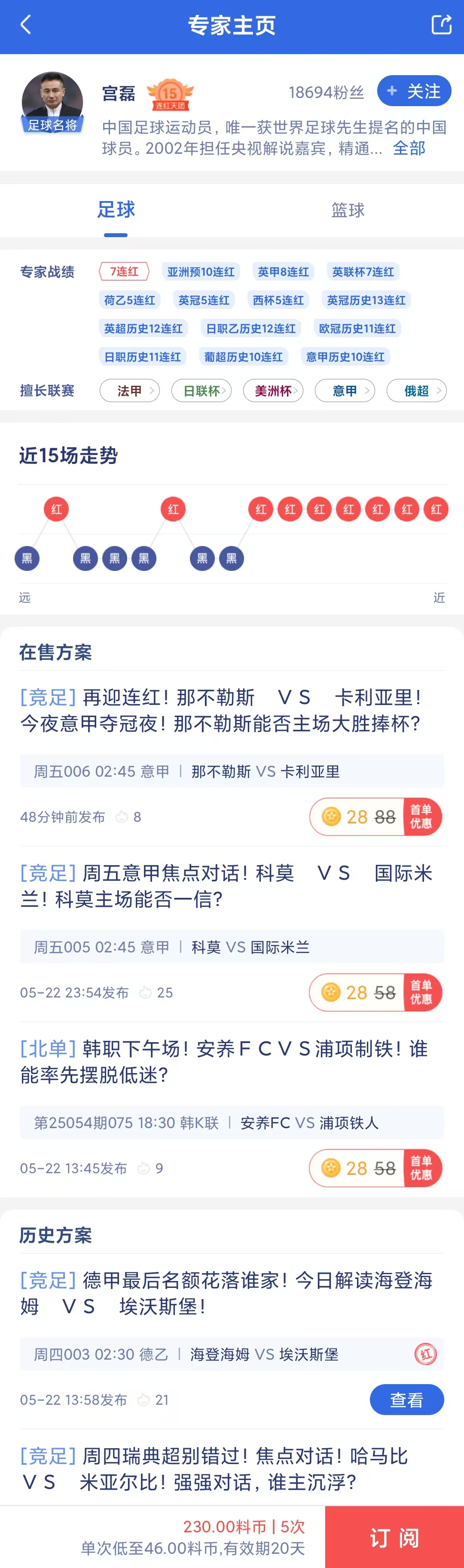 竞彩专家“宫磊”在冷门颇多的日子里,斩获7连红,状态也是相当的出色!今日精选方案已更新,订阅看方案更优惠!