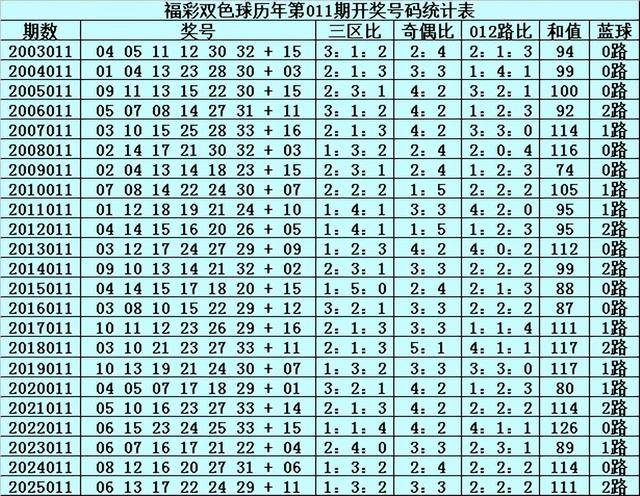 在第011期历史同期奖号中,红球三区分布总比例为41:54:43,奇偶总比例为69:69,012路比为51:42:45,和值分布在74-126之间,蓝球号码012路总比例为10:7:6。