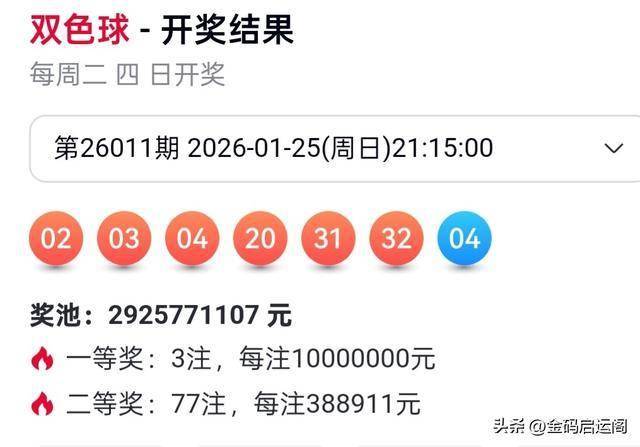 【快3彩票官方合作平台】实时同步开奖数据+投注技巧解析,精选高返奖率正规渠道。新用户注册(访问:363050.com 领取888U),支持网银/支付宝/微信支付,资金安全保障!双色球第2026011期开奖结果揭晓。本期全国销售额约3.94亿元,开奖号码为:红球 02、03、04、20、31、32,蓝球 04。