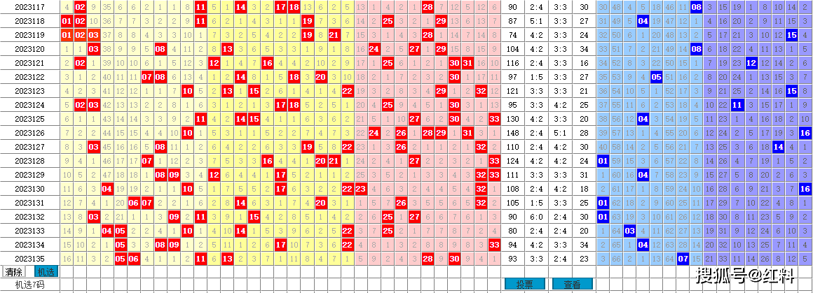 把33个号码按01-05,06-11,12-16,17-22,23-27,28-33分成6个区间后可以看出,每期肯定会有1-2个区间轮空,1个居多,而且每期肯定会有以上边码开出,本期参考01 05 06 11 12 16中出号,